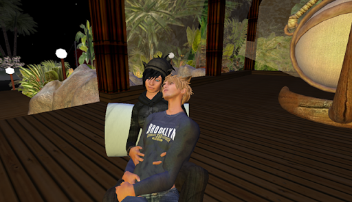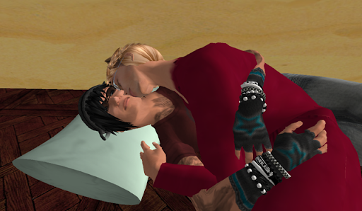 Esmie was my first love in SL, and he is my best friend now.  When we split up I truly thought I would die.  I was so shattered.  I love Esmie now - I couldn't possibly live my life without him.  He is there to pick me up when I stumble.  He is there to hold my head when it hurts.  I love him, I love his partner Nicho, I love them both together.  Without Esmie I would be lost.